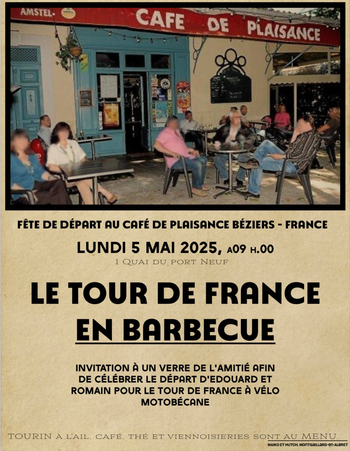 Découvrez le vidéo de notre départ : 5 mai 2025, café de plaisance. Béziers.